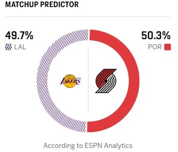 今日ESPN晒出了本场胜率预测,湖人为49.7%,开拓者为50.3%。